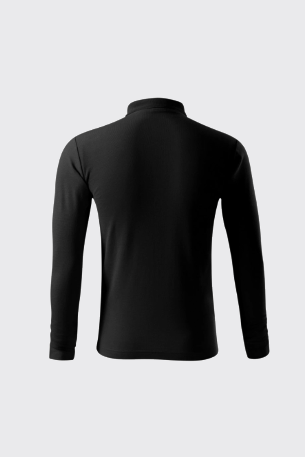 Polo gesneden met zijnaden. 1:1 ribgebreide kraag en mouwzomen met dubbele reliefstreep. Sluiting met 3 knopen in de kleur van de schaalstof. Binnenhalslijn met een tape van shell-stof.