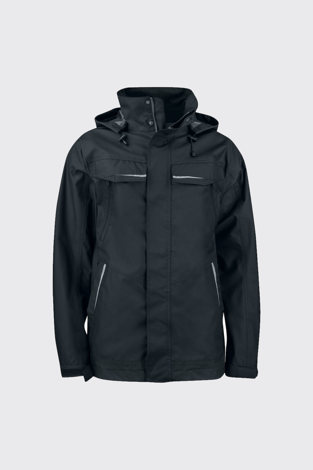 Gevoerde wind- en waterdichte jas met getapete naden. 2-weg ritssluiting met flap bedekt met een drukknoopsluiting. Waterdichte ritsen. Afneembare en aanpasbare capuchon. Voorzien van twee borstzakken met klep en velcro sluiting. Lus voor badgehouder, zijzakken met fleece gevoerd. Drie grote binnenzakken waarvan twee met ritssluiting. Aanpasbare taille en aanpasbare mouwen met velcro. Verlengd rugpand en windvangers in de mouwen.